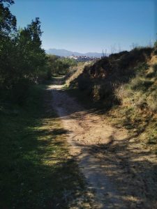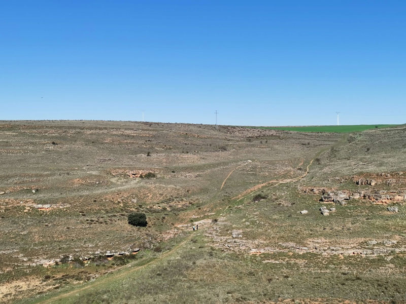 La vía discurre a campo abierto, escoltada por el declive de la lastra del paraje de ‘Las Fuentes’ a su izquierda y tapiales de antiguas huertas a su derecha, jalonados por ejemplares de almendro.