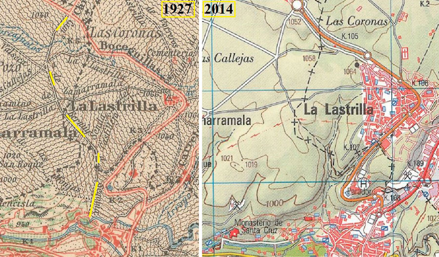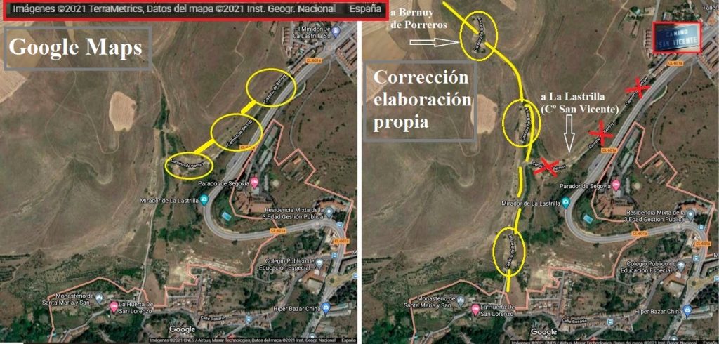 La aplicación referida asocia el Camino de Bernuy a una antigua vía, hoy muy deteriorada por las escorrentías, que partiendo de dicho camino sube a La Lastrilla.