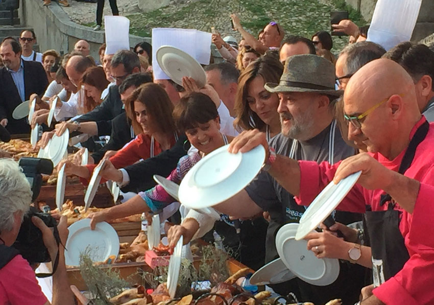 Sobre 1.400 comensales, a 3€ la ración, rindieron tributo al cochinillo nuestro de cada día en el acto central de la Semana de Turismo y Gastronomía, la V Fiesta de Exaltación del Cochinillo. “Bendijeron” los 60 tostones de la comilona los pregoneros de 2017, Sacha Hormaechea (Restaurante Sacha) y Mario Sandoval (Restaurante Coque), obrando de testigo la consejera de Agricultura, Milagros Concepción.