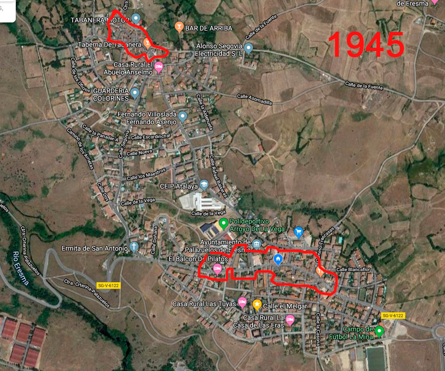 Delimitado en rojo, el casco urbano en 1945 contrapuesto al actual de Tabanera-Palazuelos.