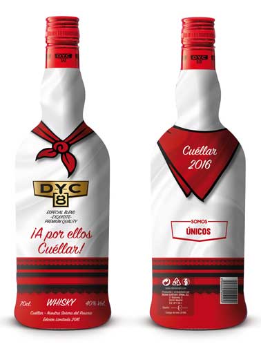 DYC rinde un homenaje a las fiestas de Cuéllar con la edición para este 2016 de una botella del 8 años “vestida de peñistas” del tapón al culo. El homenaje se completa con una vitola “Cuéllar 2016” y el emblemático lema “¡A por ellos!”. El diseño se remata con una ilustración de encaje que rememora la falda de los trajes regionales castellanos.