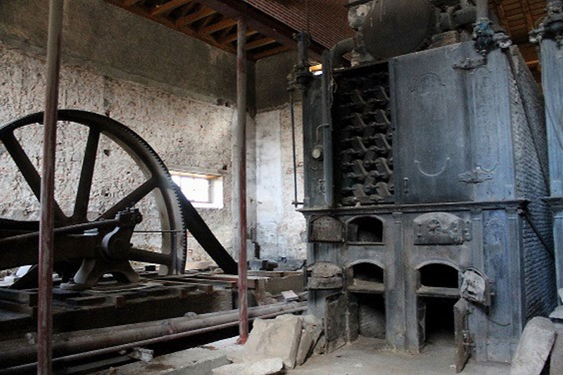Fachada del Real Aserrio. Abajo, diferentes vistas de las centenarias y abandonadas instalaciones. Fotos de Segoguiados.
