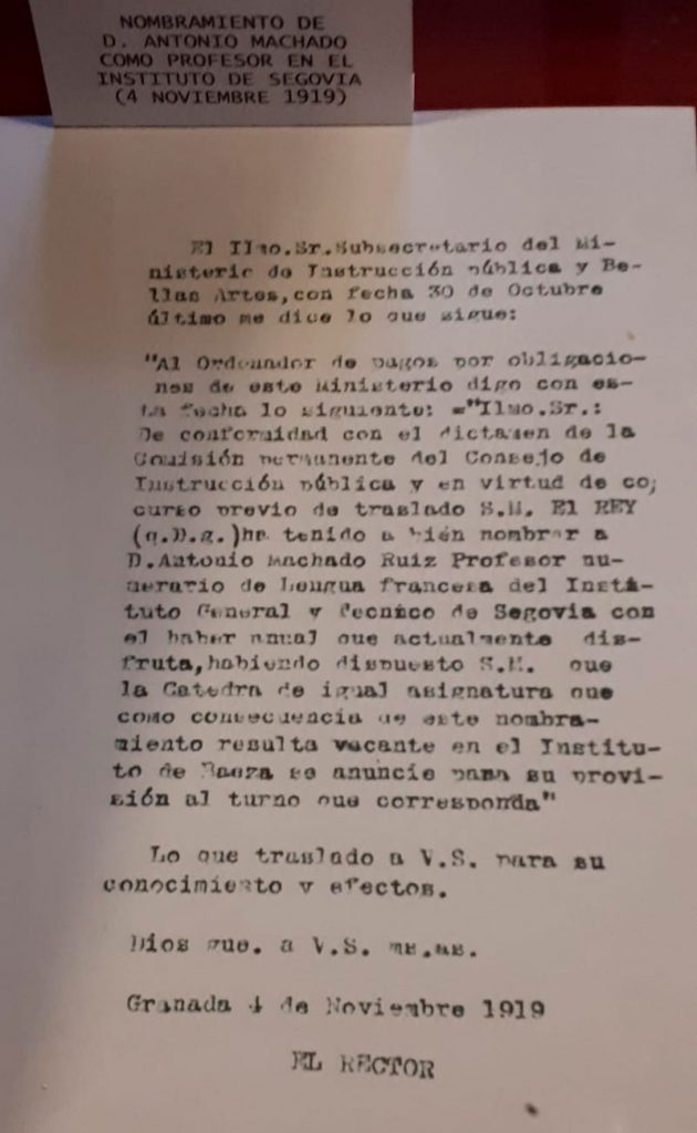 Nombramiento de Machado como profesor adscrito a Segovia.