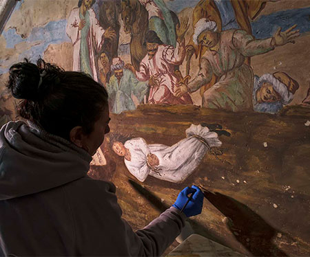 Arriba, detalle de la restauración. Sobre estas líneas parte de la “laguna” repintada y vaciada de los añadidos.
