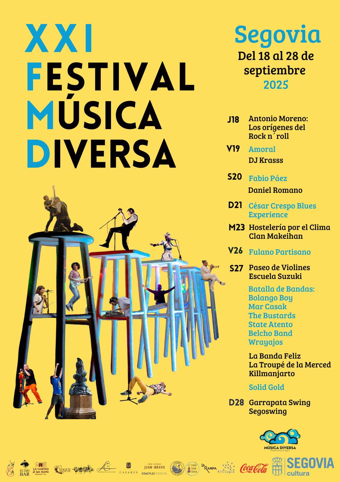 El sábado 27 concentrará la mayor parte de actividades, con un paseo de violines a cargo de la Escuela Suzuki Segovia desde el Acueducto a la plaza de San Martín, donde se celebrará un batallón de bandas con seis formaciones locales. La jornada continuará con un “tardeo” en el Jardín de los Zuloaga y finalizará con una sesión de DJ en el centro histórico. El festival concluirá el domingo 28 con una actuación de swing en la plaza de San Martín a cargo de Garrapata Swing y la asociación Segoswing.