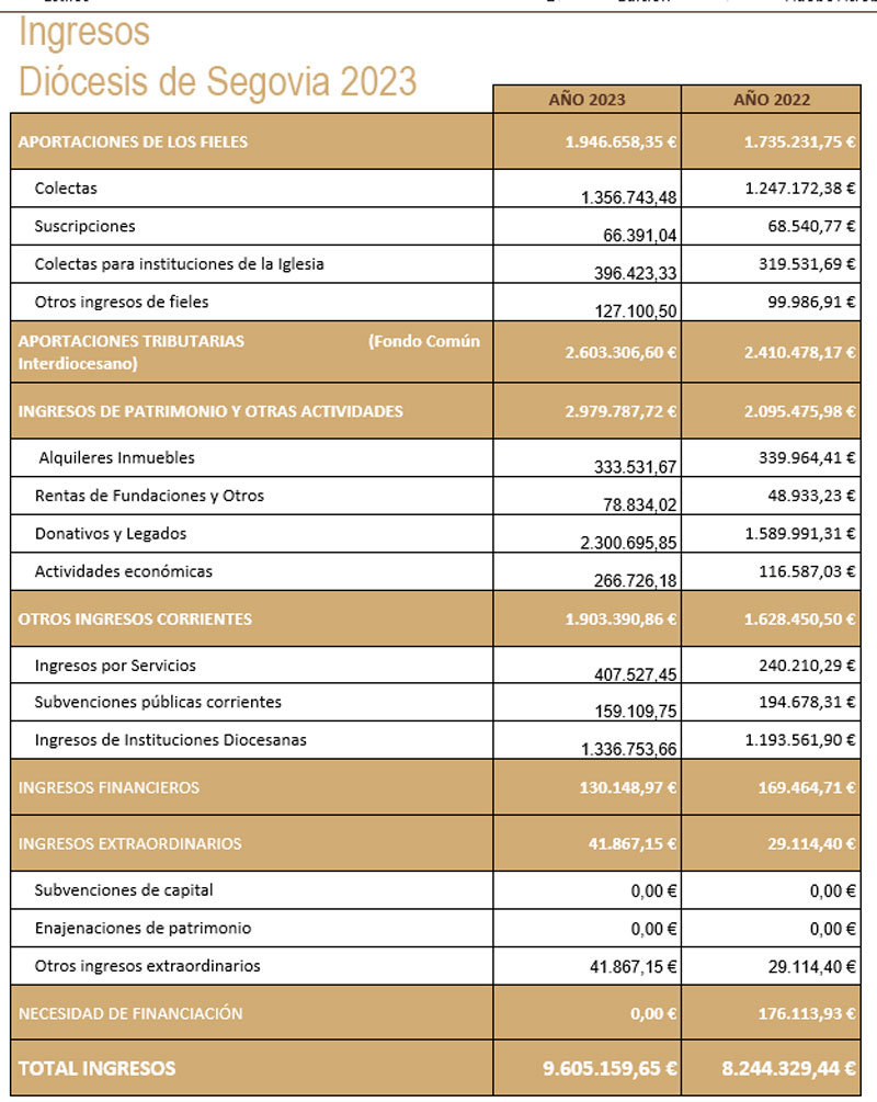 La diócesis de Segovia hacía públicas las cuentas de 2023 y que revelan una importante mejora en las cuentas del obispado. El pasado año la diócesis ingresó 9,6M€, ajustando a esa misma cantidad los gastos y saliendo de los números rojos. Así si en el ejercicio anterior de 2022 las cuentas registraban un desequilibrio de 176.000€, en 2023 se reduce esta partida a cero.