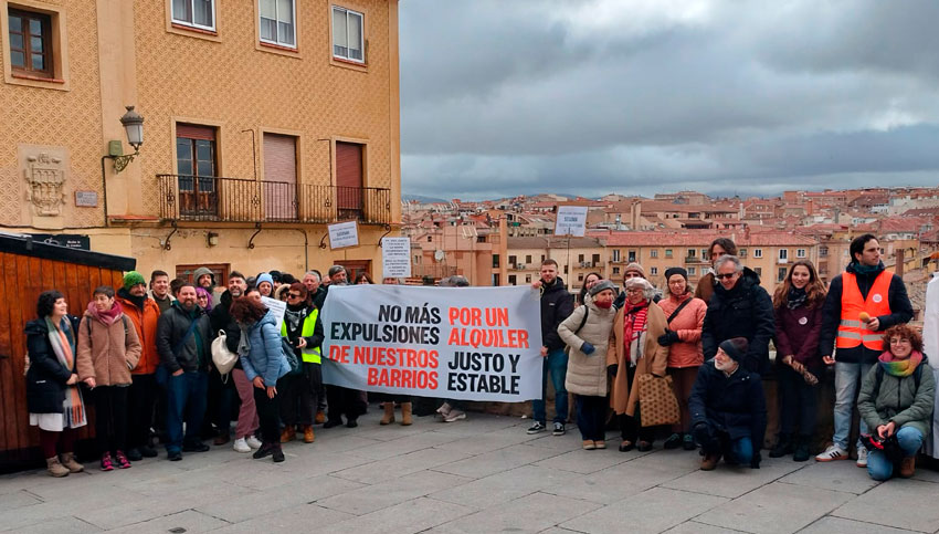 Organizado por el Sindicato de Inquilinos de Segovia, unas decenas de ciudadanos participaron el sábado 31 de enero en un paseo reivindicativo que pretende evidenciar el acuciante problema de la vivienda, que los manifestantes achacan a “los rentistas que se lucran con la IE (Universidad privada de Segovia) impidiendo el acceso a la vivienda de las trabajadoras y posicionarse frente a la truristificación que expulsa a las vecinas de sus barrios”, explica Foro Social de Segovia, una de las organizaciones que secundaba la movilización.