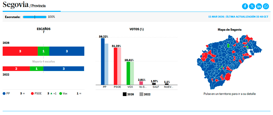 En el éxito del PSOE mucho tiene que ver el pinchazo de Vox en la provincia. A los socialistas les ha bastado mantener el porcentaje de voto de 2022, con un 31.2%, porque lo cierto es que la formación ultraderechista se ha quedado lejos en la lucha por este séptimo procurador, se queda con lo que tenía y no logra sumar votos en la provincia, todo lo contrario, pasa del 31,4% al 31,3% en un contexto en el que a priori salían como los grandes favoritos para subir en representación. En Segovia, los de Abascal han registrado un claro fiasco.