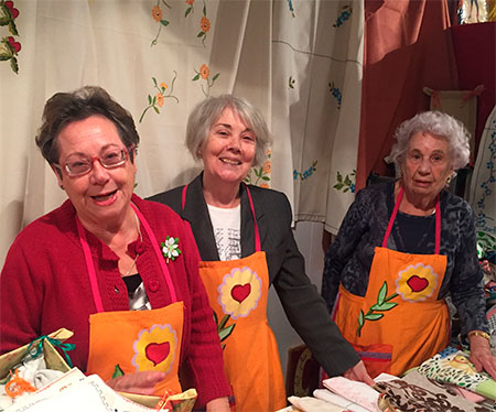 Paquita y Luisa, junto a Maribel, gestionan otro de los mostradores en los que lucen mantelerías, delantales, bolsas de pan… realizados en telas de algodón pintadas a mano… ¡Un Primor! Las dos primeras llevan 18 años en la labor, Maribel 7 u 8. Paquita y Luisa hacen estas labores con sus propias manos y, cada dos años, vienen al Rastrillo a vender el resultado. Presumen de su trabajo: “ Tenemos unos delantales y unas bolsas de pan…”, y de sus ventas: “La última mantelería grande la hemos vendido hace un momento…” y, solo desean ¡Venderlo todo para no tener que recoger nada del mostrador cuando el Rastrillo termine!