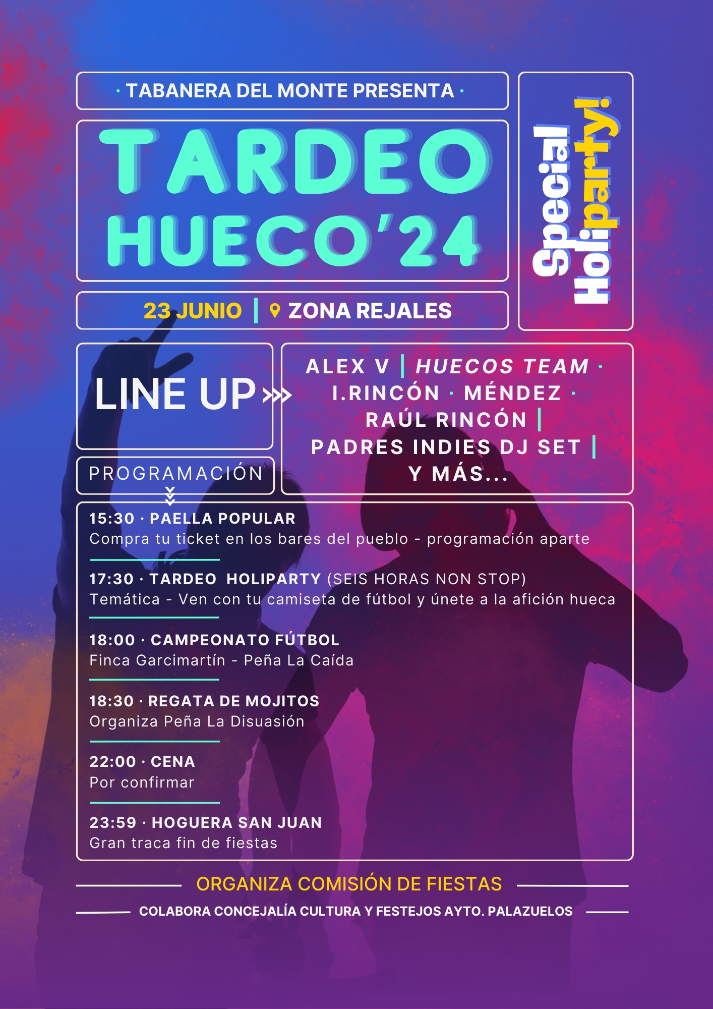 En el apartado de verbenas, la del viernes contará con la animación de la orquesta Pikante, mientras que el sábado será el turno de la orquesta Kronos. Además, este año se introduce una gran novedad en la programación: el Tardeo Hueco de la Peña Los Huecos. Este evento incluye una variedad de actividades como la fiesta Holi cargado de djs locales e invitados, un campeonato de fútbol, una regata de mojitos y culminará con la Hoguera de San Juan y una traca final de fiestas.