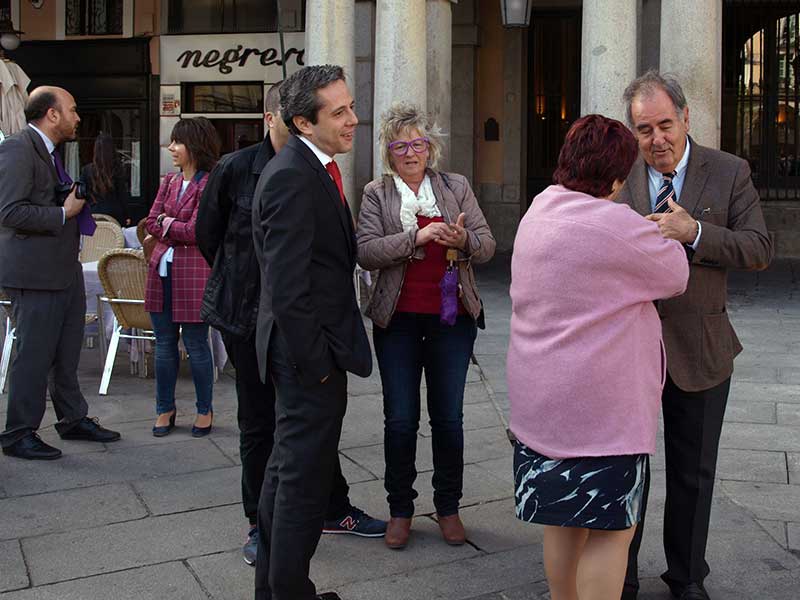 La regidora de Madrid tenía destino —esta también— en San Quirce, aunque pasó por el Ayuntamiento por cortesía y los nuestros, pues también muy corteses: Luquero vestía chaqueta malva (bueno, ella se apresuró a explicar que es rosa); su jefe de gabinete, Daniel Casal, corbata morada y, la más cumplidita, Paloma Maroto, con paraguas y gafas en el color corporativo de Podemos, mientras otros asesores también tiraban hacia la misma gama de colores… La casualidad, que a veces hace estas cosas.