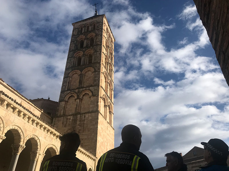 Con la veleta “tumbada” y cimbreándose a cada racha de viento, el jefe de la policía, Julio Rodríguez Fuentetaja y los jefes de servicio de bomberos contemplaban con preocupación la situación a la vez que han ordenado acordonar la zona para evitar el aparcamiento y también el paso de peatones junto al templo.