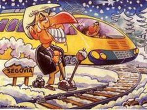 Vamos, que durante una década me harté de escribir —en El Adelantado y en Gente, donde presté servicio— acerca del proyecto ferroviario y su desarrollo paso a paso, de lamentar que los diseños originales dibujaban una vía que partía la provincia por la mitad sin paradas segovianas, del alegrón general cuando se acabó aceptando la “quinta alternativa” que incluía el enorme túnel bajo la sierra que salía a las puertas de Segovia y de la polémica que se montó, sobre todo con los de su partido, cuando el diputado popular Javier Gómez Darmendrail, felicitó la Navidad de 2001 con una viñeta en la que se atribuía a sí mismo los méritos de la llegada del nuevo ferrocarril a la capital.