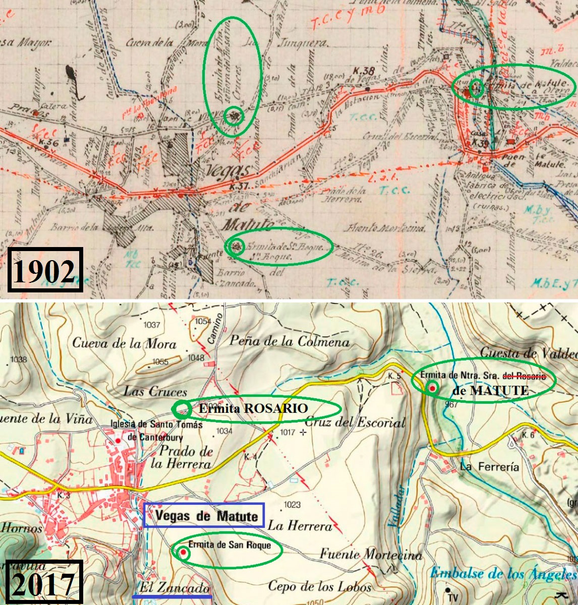 La ermita de Ntra. Sra. del Rosario la sitúa el mapa en el lugar de Ntra. Sra. de Matute, no apareciendo la anterior.