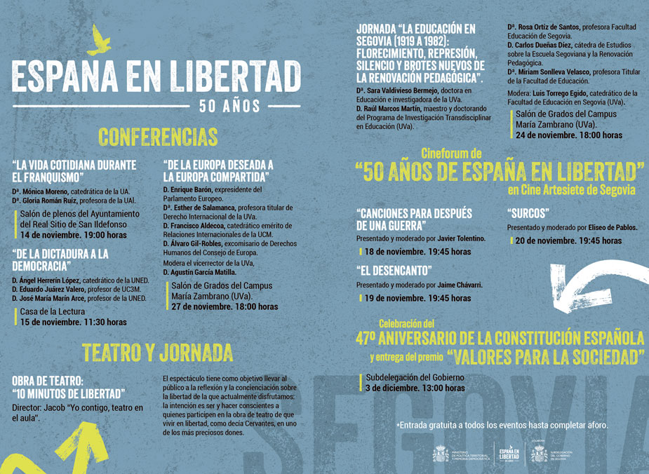 Con motivo del 50 aniversario de la muerte de Franco y el inicio de la democracia, el ministerio de Política Territorial y Memoria Democrática y la Subdelegación de Gobierno en Segovia, programan un ciclo de charlas, proyección de películas y documentales, teatro y eventos culturales relacionados con la transición democrática.