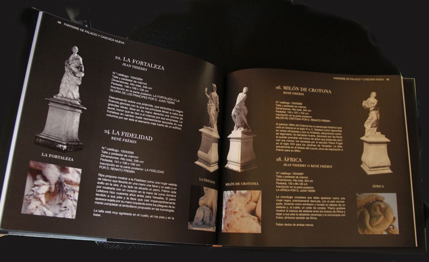 A través de micromecenazgo, la librería granjeña Farinelli, editó en 2017 Estatuaria Jardines de La Granja de San Ildefonso, suerte de catálogo y estudio de la estatuaria obra de Pedro Heras y Javier González Hontoria. Pieza a pieza el libro nos informa de la autoría de cada estatua con un buen despliegue de mapas e imágenes de contextualización y amena información sobre los pormenores. Detalles como el gran taller que los impulsores iniciales del proyecto en el antiguo palacio de Valsaín, y cuya devastación a primeros del siglo XIX  nos privó de toda la colección de moldes, fundiciones y piezas que allí se guardaban. Por el libro pasan también Jean Thierry, los hermanos Dumandré o René Fémin, escultores que el rey trajo de Francia y que duran décados se consagraron a poner en pie el sueño regio de un Versalles en el Guadarrama.