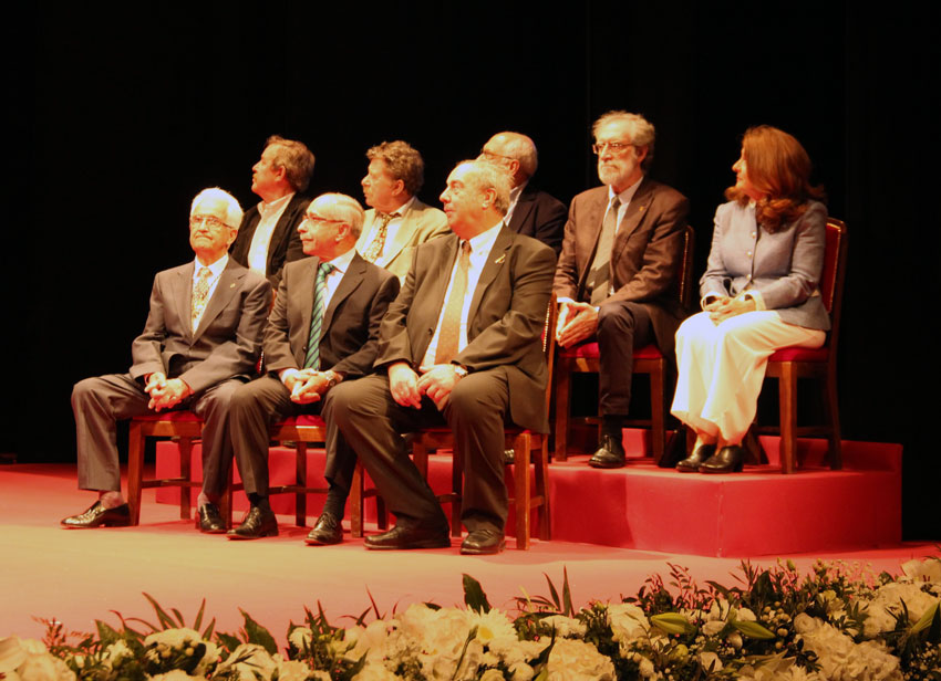 Lo siguiente fue la entrada del pleno corporativo, acomodado en el proscenio frente por frente con los galardonados. Con simpático gesto de Ricardo Díez, saludando a sus compañeros alcaldes y preguntando ¿dónde me pongo? A partir de allí empezó el acto, con vídeos loando a los respectivos homenajeados y palabras de agradecimiento de los mismos, salvo Pedro Delgado, a la sazón en Japón, que compareció por plasma.