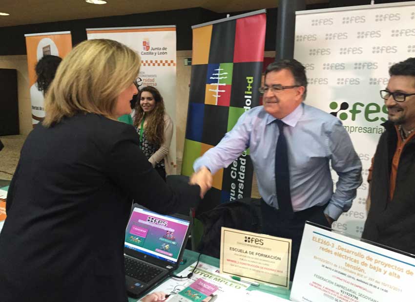 Fotos: la ministra, en la clausura de la feria Tándem. Saludando a trabajadores de la FES y de las empresas radicadas en la feria. “Piquete” sindical a la llegada de la ministra al campus. Vista general de la II Feria del Empleo de Segovia y Provincia. En la sede del PP, junto a Vázquez y Palomo.