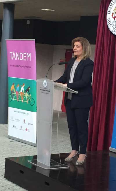 Ya en el entarimado del campus, Báñez felicitó a los organizadores por la iniciativa, una feria de empleo muy concurrida y animada tanto desde la perspectiva estudiantil como empresarial. También entregó al presidente de la Diputación, Francisco Vázquez, el sello de adhesión a la Estrategia de Emprendimiento y Empleo Joven, marca que reconoce la labor realizada por la institución provincial para trabajo joven fomentar el emprendimiento en iniciativas como ¿Cuál es tu vaca?, Ayudas a Emprendedores o el Plan de Empleo Joven.