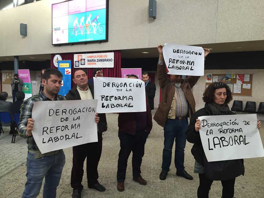 A su entrada al campus María Zambrano, como es ya tradicional, la ministra fue recibida por un piquete de sindicalistas. Hubo un educado contraste de opiniones en el que los sindicalistas reclamaron la revocación de la reforma laboral y afearon a la ministra la existencia de 5.500 desempleados en Segovia sin prestación, “pero que reciben la renta de inserción”, les recordó la ministra.