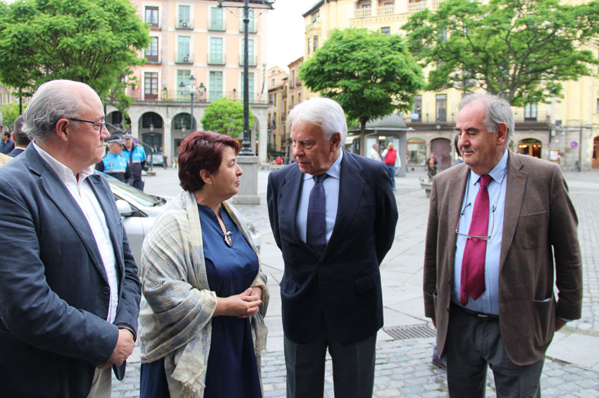 Así que Felipe González vino con media hora de adelanto al acto previsto en el Ayuntamiento de Segovia. Un vehículo le trajo directamente de Madrid para dejarlo frente al consistorio, donde fue recibido por Clara Luquero. A continuación el ex presidente estuvo 30 minutos tomando café en la sala blanca con la alcaldesa, concejales, el presidente de la fundación Valsaín, Alvaro Gil Robles, y con la prensa. No estaban previstas declaraciones pero la cercanía casi lo obligaba, de modo que González avanzó las líneas argumentales de su conferencia y salvó como pudo las obligadas preguntas sobre el proceso de primarias del PSOE. Si bien su apoyo a Susana Díaz parece claro, González no quiso ejercer de “jarrón chino” y paso de puntillas por la batalla interna por el liderazgo del PSOE. “El debate ha sido un éxito en sí mismo”, valoró. Habló de qué es un momento difícil para el partido “y habrá otros más difíciles”, a partir de aquí, González se dedicó a vender su europeísmo, que propugna “un espacio público compartido de ciudadanía”.