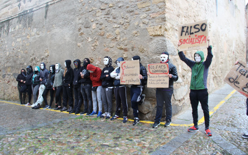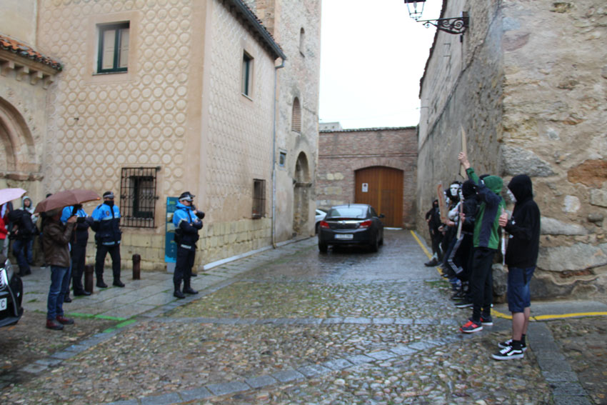 Entre tanto, fuera. una quincena de anónimos enmascarados desafiaba la lluvia. Algunos conatos de gritos -“Felipe asesino”, “Fuera fascistas”- que lograron colarse en San Quirce. “Ya están ahí los de siempre”, comentó como resignado González. La policía, una decena de agentes entre locales, policías nacionales de uniforme y de paisano, conminaron a los manifestantes a identificarse y templaban gaitas cuando el griterío subía de tono; podían estar en la puerta pero sin escándalos. Los del escrache formaron entonces una fila y allí se quedaron, desafiantes. Aguantando el chaparrón con sus consignas que si este es fascista, el otro más. En fin… Cosas que pasan en Europa.