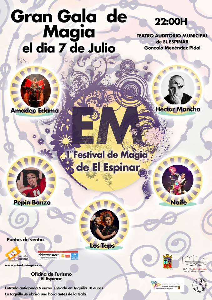A las 22 horas, en el auditorio Menéndez Pidal, gran gala mágica con los magos Amadeo Edama, Héctor Mancha, Pepín Banzo, Naife y Los Taps. Las entradas se pueden adquirir previamente en la oficina de turismo o en www.entradaselespinar.es, al precio de 6 euros, o en taquilla el mismo día, por 10 euros. Lo espectáculos del Baúl del Mago tendrán un precio de 2€ (entrada a comprar en la taquilla de la caravana)
