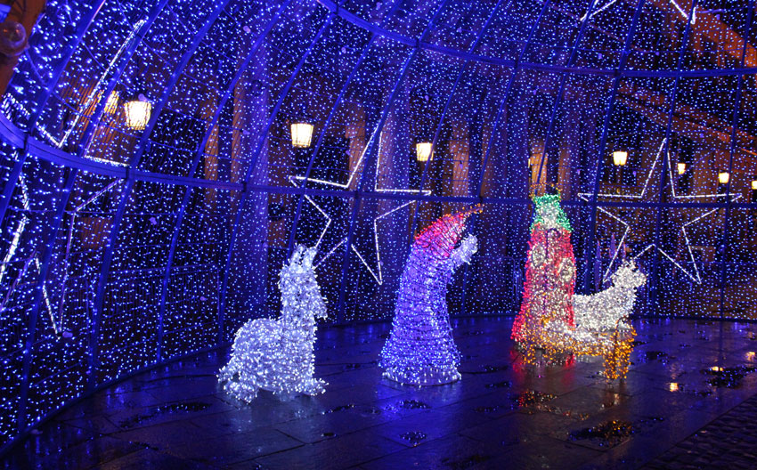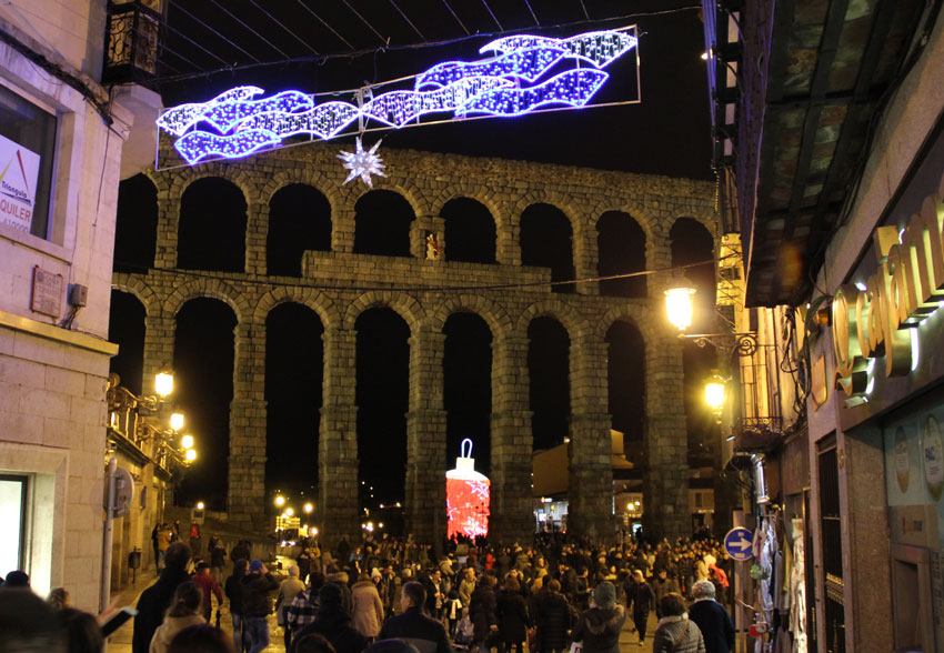 “Pues sí que ahorran los segovianos en esto de las luces”, comentaba una turista madrileña en plena subida por la calle Real, atestada de visitantes. Y es que acostumbrados a ver papanoeles y estrellitas desde pasado Difuntos a los madrileños se les hacía raro lo de Segovia, como publicaba un medio segoviano, la última capital de España en darle a las luces de la Navidad.