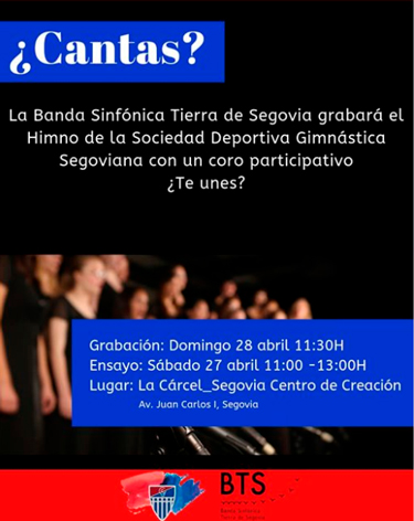 La Banda Sinfónica Tierra de Segovia ha efectuado un llamamiento para recabar voluntarios para la formación de un gran coro. El objetivo es grabar una versión del himno de la Gimnástica Segoviana. La grabación será el 28 de abril, en La Cárcel Centro de Creación a las 11:30 horas; el día antes, el 27 de abril en el mismo lugar pero de 11 a 13 horas, se procederá a los ensayos. Están invidatos la directiva del club, jugadores, aficionados… Y por descontado todos aquellos que quieran aportar su voz.