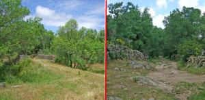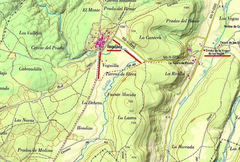 Cerca de Requijada, por la zona denominada La Veguilla, un estrecho camino a nuestra derecha, flanqueado por tapias semiderruidas y abundante vegetación, nos permitiría salvar el pueblo –ver croquis Cuaderno de Campo y mapa IGN-III-.