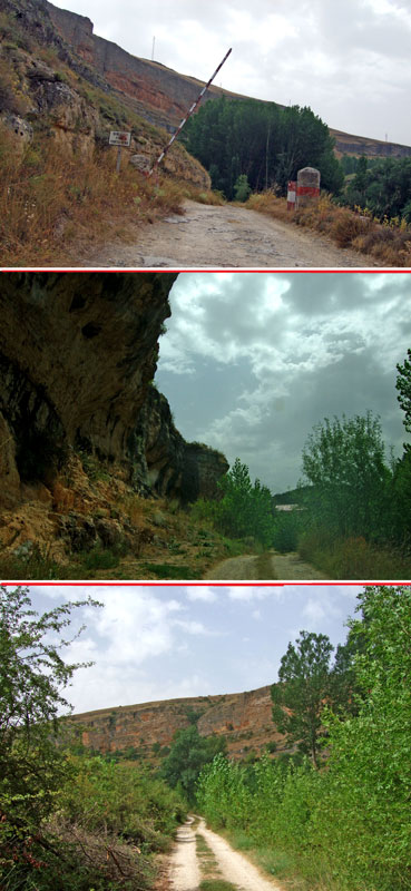 Al principio, sendero y senderistas, caminan bajo los cortados del estrecho vallejo que forma el río Duratón. Una vez pasado el molino y sus dependencias (Recorridos: 3,450 km/aprox.), ya fuera de la propiedad, el valle se va ensanchando.