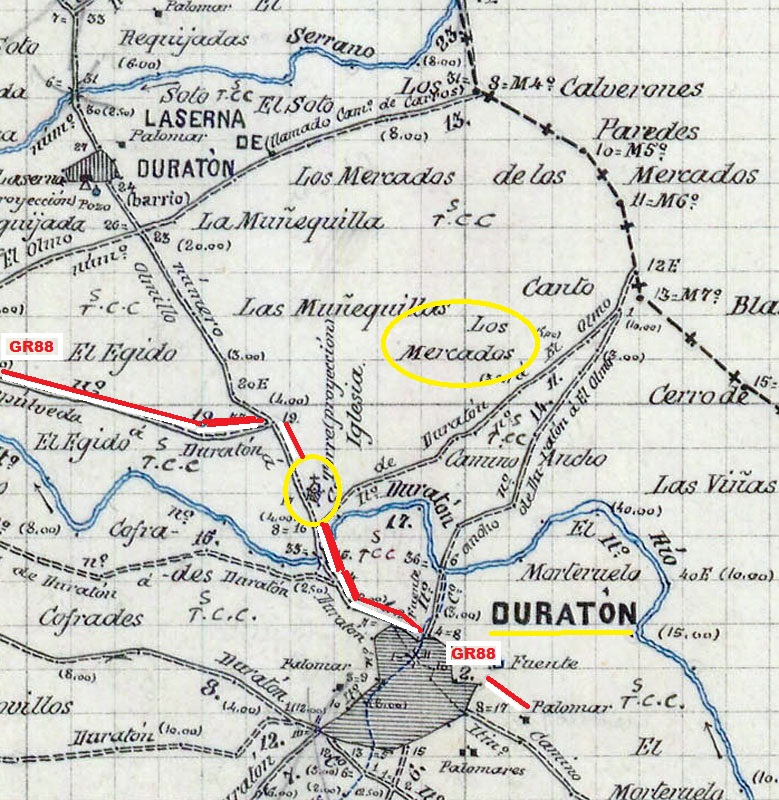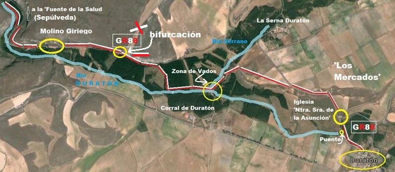 Por la izquierda parten rodadas que se dirigen al caserío de La Serna Duratón. Hay que continuar de frente para desembocar finalmente en un camino, hoy asfaltado, que desciende al pueblo de Duratón desde La Serna –ver plano Google 03-.