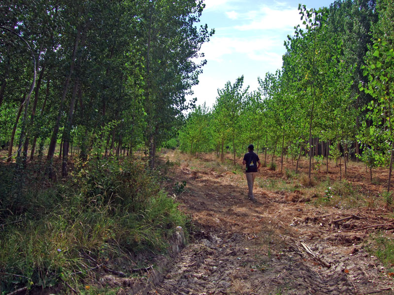A la derecha se extienden grandes choperas. Por la izquierda, la pelada ladera que desciende de los terruños de labranza.