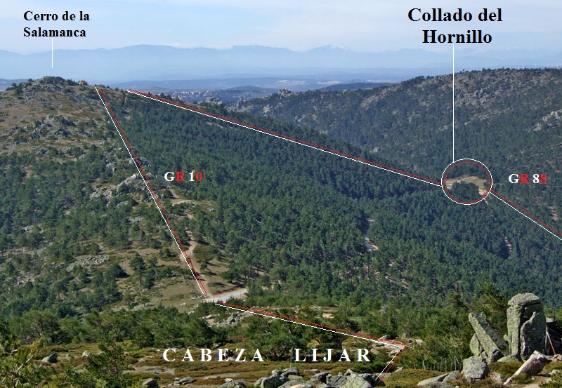 El paseo por el ‘GR88‘ comienza en un pequeño bolo pétreo en el collado del Hornillo. Su trazado, aunque descatalogado, como hemos indicado, aparece reflejado en el mapa del Instituto Geográfico Nacional, IGN 1:50000 Cercedilla-508 (Trazo discontinúo rojo).