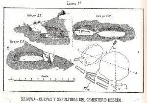 […] que la Cuesta de los Hoyos era el cementerio de los judíos […]. Los investigadores se preguntan: ¿A qué uso fueron destinadas? ¿A enterramientos o cámaras sepulcrales? No es creíble, porque en ella no han aparecido esqueletos completos, ni aun en los nichos de las paredes laterales […] ¿Fueron minas para la explotación de arenas o arcillas? Resueltamente no.