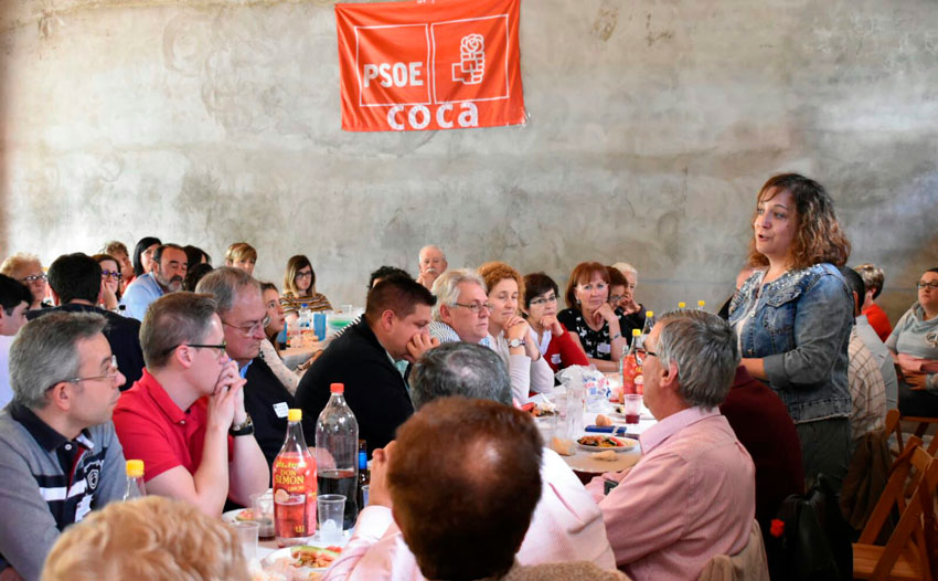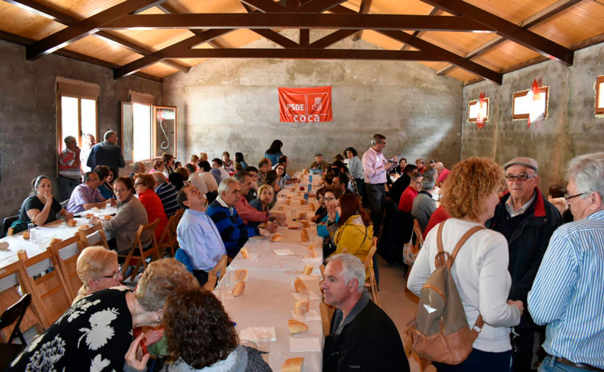Cuando no hay harina, todo el mohína, cuando abunda, bodas. Con dieciséis ediciones a cuestas, el Día de la Rosa de Coca es la comida de hermandad de los socialistas “camperos”. Sonrisas de oreja a oreja y mucha ilusión en los 150 militantes y simpatizantes que compartieron paella a cubierto (las merendolas al raso parece que serán cosa de agosto). Y es que el “asalto” a la Moncloa ejecutado por Pedro Sánchez, así como el lucido perfil de los ministros nombrados, ilusiona a la militancia. “La palabra no es, quizá, euforia, pero sí mucha ilusión y orgullo de asumir la responsabilidad”, explica el secretario provincial, José Luis Aceves, que celebraba su primer Día de la Rosa como líder del partido en Segovia.