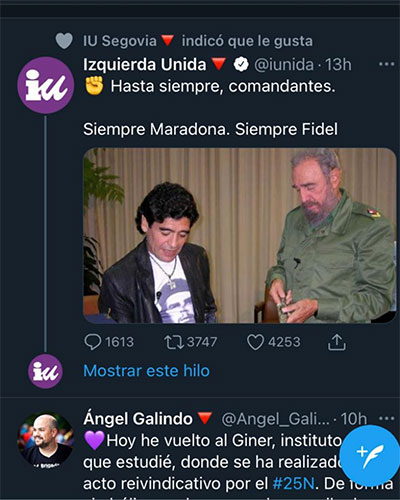 Según para quien, la noticia de la semana, que digo, del año, es la muerte del futbolista, Diego Armando Maradona, al que al parecer jugar al fútbol como lo hacía le sitúa en el Olimpo y le exonera de reproches por cualquier otro “pequeño detallito” de una vida azarosa que según sus seguidores fue fruto de la mala suerte en la vida y las malas compañías. Estupendo. Fíjese, que el mismo día de su fallecimiento, el mismo en el que en el mundo entero se clamaba para acabar con la violencia contra las mujeres llega IU de Segovia y en sus redes sociales da un inoportuno “me gusta” a una foto del Pelusa y Fidel Castro con la leyenda “hasta siempre, comandantes”. Todo bien si no fuera porque el argentino ha sido acusado varias veces en su vida de maltrato a las mujeres… Justo debajo, Ángel Galindo hacía un comentario mucho más acorde al posicionamiento reivindicativo activo que mantiene la formación respecto al maltrato a las mujeres. ¡Ojo a los clics!