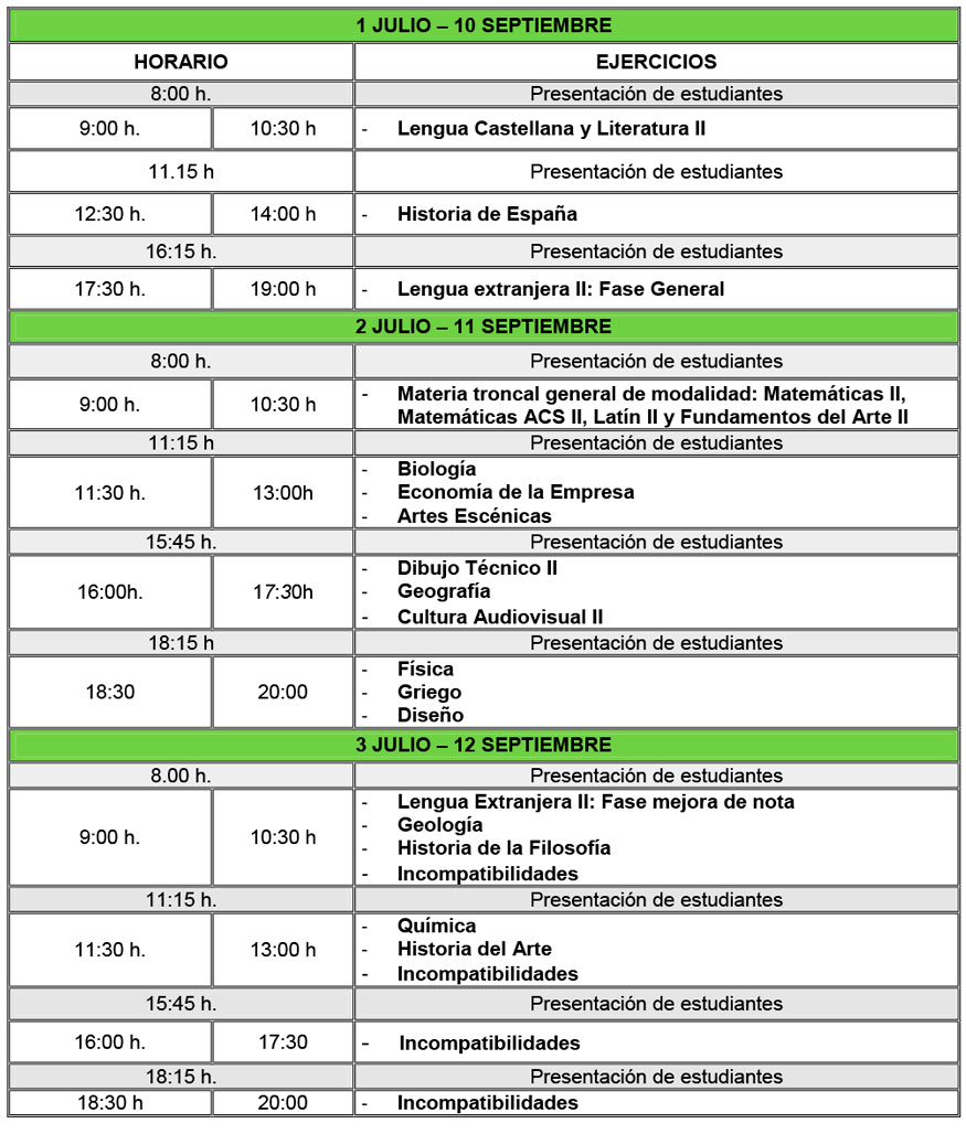 Las pruebas empiezan a las 8 de la mañana con la presentación de los estudiantes a los exámenes de Lengua Castellana y Literatura II; 11:15 Historia de España; 16:15 la fase general de Lengua Extranjera. Al día siguiente y al otro, más. Los 337 alumnos del Ezequiel González, Cantalejo, Andrés Laguna, Concepcionistas y Vega de Pirón pasan la prueba en el Andrés Laguna, el resto, al campus Zambrano.