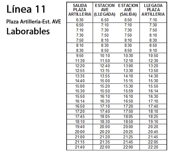 Por favor, ¿cuáles son los horarios desde la estación AVE a la plaza de Artillería de lunes a viernes? Muchas gracias de antemano por su respuesta.