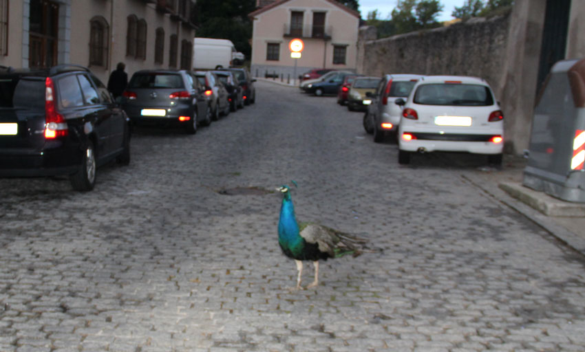 A Houdini lo conocí el pasado mes de junio, saliendo del pleno de La Granja por la calle Calvario, allí le tomé la primera foto. El pavo estaba en el medio de la calzada, confrontado a un 4×4 de la Guardia Civil. Durante unos minutos los agentes debieron estar hojeando el manual acerca de “procedimientos relativos a la evacuación de pavos reales en calles urbanas”. O consultando con Patrimonio Nacional. Me imagino el cuadro: “patrulla a comandancia, tenemos al pavo en la calle Calvario, repito, calle Calvario, corto”. Lo dejaron estar y siguieron la ronda.