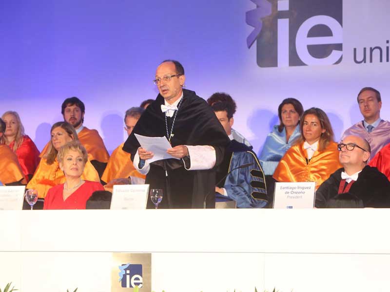 Durante su disurso, el Rector puso el acento en los planes de crecimiento y de inversiones para los próximos años en Segovia y en el campus en el norte de la capital, un campus vertical de 165 metros de altura y 50.000 metros cuadrados de superficie, que se ubicará en la quinta torre del Paseo de la Castellana. Este campus IE, que tiene previsto su apertura en 2019, “formará parte del horizonte de la ciudad”.