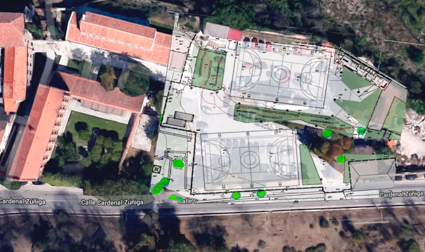 La superficie a intervenir está en el actual aparcamiento del recinto universitario donde se proyecta un área para realizar ejercicio físico al aire libre aprovechando al máximo la superficie disponible, para lo cual está previsto construir en terrazas para salvar el desnivel existente en las que se integrará un pequeño graderío junto a dos pistas polideportivas. La propuesta contempla también una zona de descanso, que mantiene la vegetación existente. Por último, se pretenden adaptar las edificaciones anexas al Convento para vestuarios mixtos, con el mismo volumen, según consta en el proyecto aprobado por la comisión provincial de Patrimonio en diciembre de 2017.