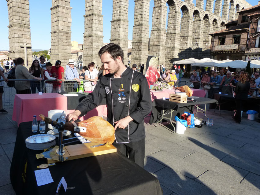 Es la situación del jamón, que esta semana tiene su escaparate en la Avenida del Acueducto, donde la Asociación de Camareros de Segovia, organizadora de la feria, empezó el 5 de septiembre con su rosario de actividades, concurso de tortilla y provincial de cortes de jamón. Sobre una decena de aspirantes al título de mejor cortador de jamón de la provincia con un jurado que lo parametriza todo, homogeneidad de las lonchas, rapidez, estética, precisión al componer las raciones de 100 gramos que luego, a 4€ la ración, se reparten entre el público… Más abajo, en la carpa Tierra de Sabor, venta directa de jamones y otros productos artesanos. Hasta el domingo 8 de septiembre.