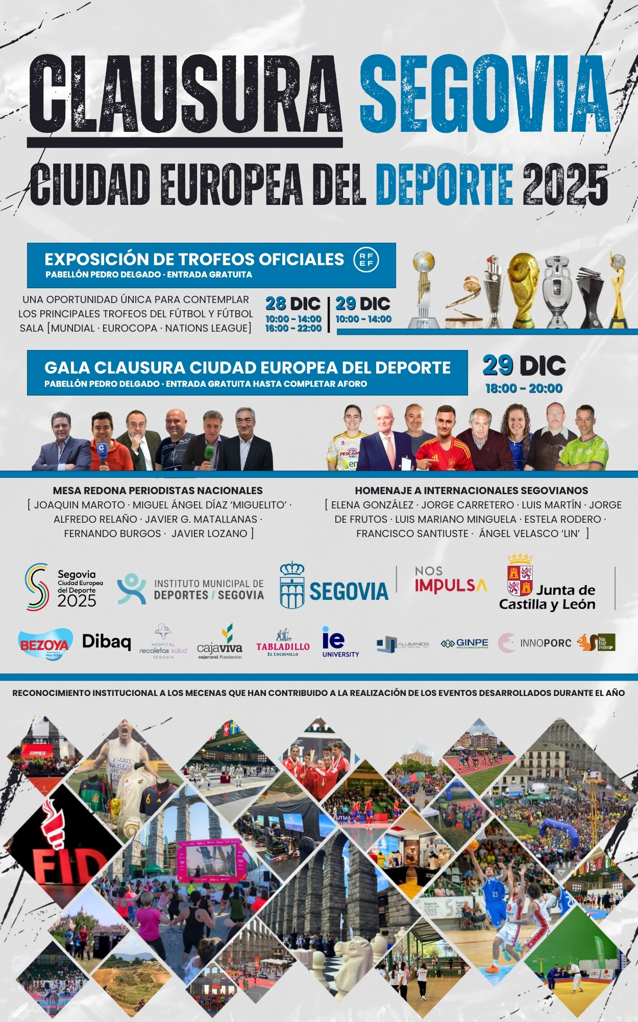 La tarde del lunes 29 estará reservada para la Gala de Clausura de “Segovia. Ciudad Europea del Deporte 2025”, que se celebrará en el mismo pabellón a partir de las 18.00 horas, con entrada libre hasta completar aforo.