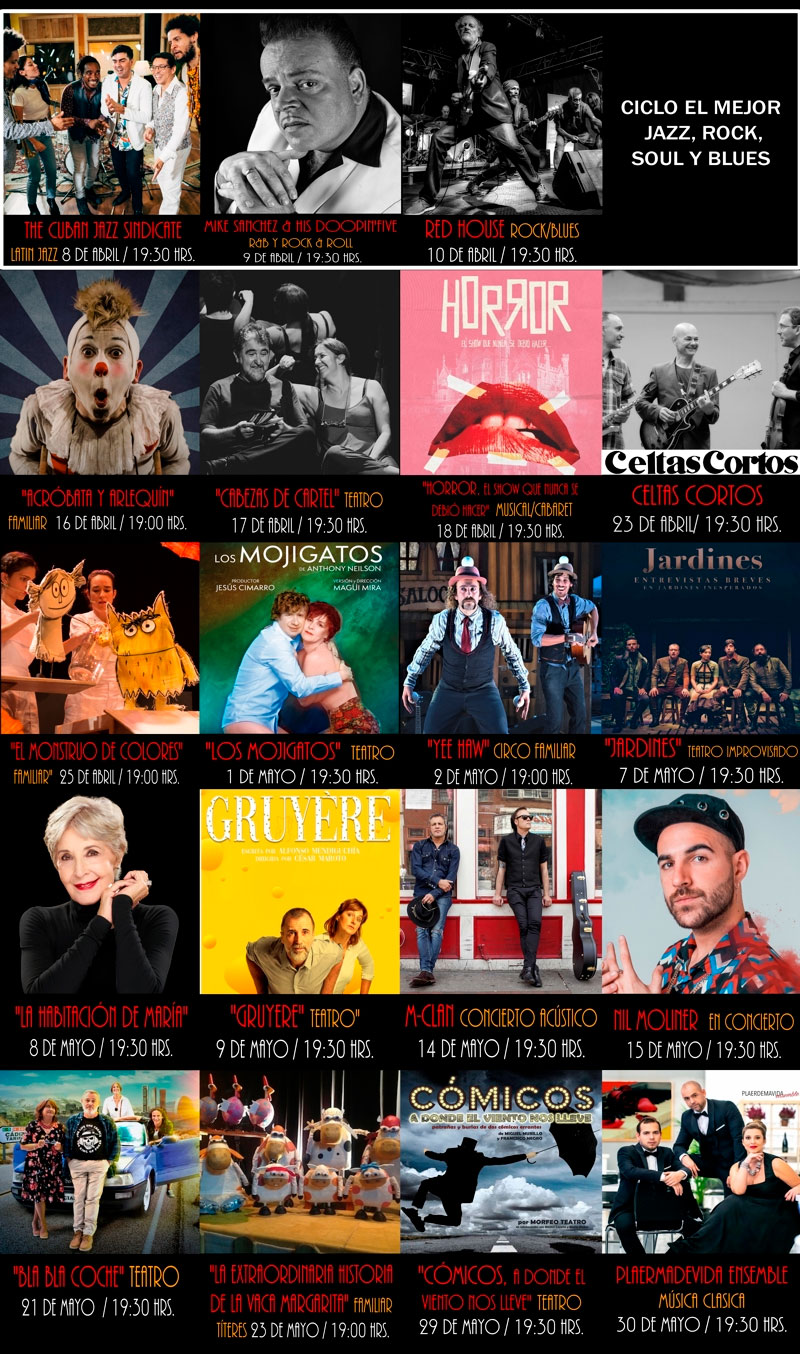 Cuadrar los bolos para el Festival de Soul, Jazz y Rock, tampoco ha sido fácil. La gran mayoría de bandas internacionales, entre ellas la esperada de Richie Ramone (uno de los 3 “Ramones” vivos de los 8 que pasaron por el grupo y previsto primero para marzo, luego para abril), han cancelado sus giras europeas, que la dirección del teatro espera recuperar, dándose bien, pasado el verano, ante lo cual se ha recurrido a la oferta nacional. Entre ellos Celtas Cortos (para el Día de la Comunidad, 23 de abril), M-Clan en versión acústica (14 de mayo), o el “operación triunfo” (pero de dilatada trayectoria previa) Nils Moliner (15 de mayo).