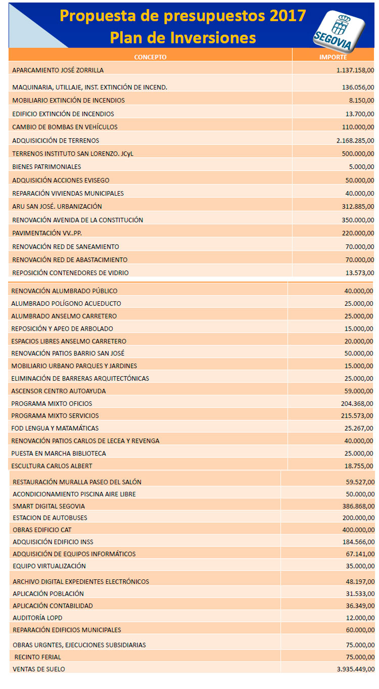 La mayoría de los 51 apuntes reflejados mantienen las mismas cantidades que el año pasado, aunque, además de los dos citados, las cifras suben en el caso del IMD (1,3 millones, 68.000 euros más); la Empresa Municipal de Turismo (952.300 euros, 32.300 más que en 2016); la partida para entidades sociales (171.000 euros, crece en 12.800); la de las entidades vecinales (96.000 euros); la del museo Esteban Vicente (50.000 euros, 12.000 más que el año pasado); las becas de guardería (46.200 euros, con un incremento de 11.200 euros) y el programa Segovia Emprende (20.000 euros y un incremento del 25 por ciento).