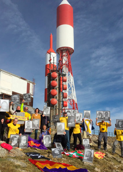 Desde su perfil de Twitter, la organización distribuye una foto con una docena de excursionistas en camisetas amarillas y portando los 18 retratos pixelados, y profusión de banderas, la de Castilla, Euzkadi, la Estelada, incluso la Estelada cruzada (la negra, la de “resistir hasta morir” de los grupusculos más radicales del movimiento). “Desde Madrid hemos querido sumarnos a la iniciativa #cimsxlallibertat. Desde la Bola del Mundo (2.265 metros) decimos bien alto: libertad presos políticos y exiliados”, explican.