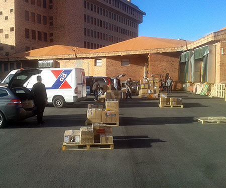 El punto de recogida, en el antiguo parque de bomberos, ha sido este sábado, un día más, un hervidero de centenares de personas que han querido realizar aportaciones de todo tipo. Allí, los voluntarios —muchos de ellos con tres días de intenso trabajo a sus espaldas— han realizado una primera clasificación por productos embalándolos en cajas. Usando furgonetas, esas cajas se han trasladado a las instalaciones de Transcose, donde se han embalado con plástico en palets diferenciados por productos específicos para hacer posible su transporte seguro en los camiones.