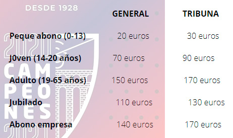Se mantiene el precio en lo tocante al Peque abono (hasta 13 años, con 20€ general y 30€ tribuna). El abono joven sube 10€ en general, pasa a costar 70€, y se mantiene el precio de tribuna en 90€. Hay un incremento notable, del 20% en el abono Adulto, de 110€ pasa a 150€, en tanto el de tribuna sube a 170€. También suben el abono jubilado, de 80 a 110€ en general y otros 10€ más en tribuna. El abono empresa sube también de 110€ a 140 (general) de 140€ a 170€ tribuna. El abono da derecho a todos los partidos de la liga regular pero no en la competición de copa, y deberá renovarse en próximas fechas. La idea de la directiva es alcanzar los mil abonos para el debut en la nueva categoría.