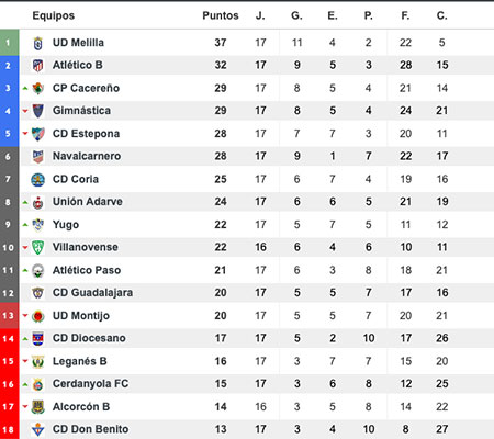 El equipo de la Albuera ocupa así la cuarta plaza, con 29 puntos y pese a la derrota no pierde comba respecto a los equipos de la parte alta de la tabla, entre los que sólo el Atlético de Madrid B (2º. 32 puntos) consiguió la victoria, precisamente contra otro de los gallitos de la competición, el CD Estepona, que cierra las plazas de ascenso con 28 puntos. El líder, Melilla (37 puntos) y el Cacereño (3º, 29 puntos) no pasaron del empate en sus respectivos compromisos.